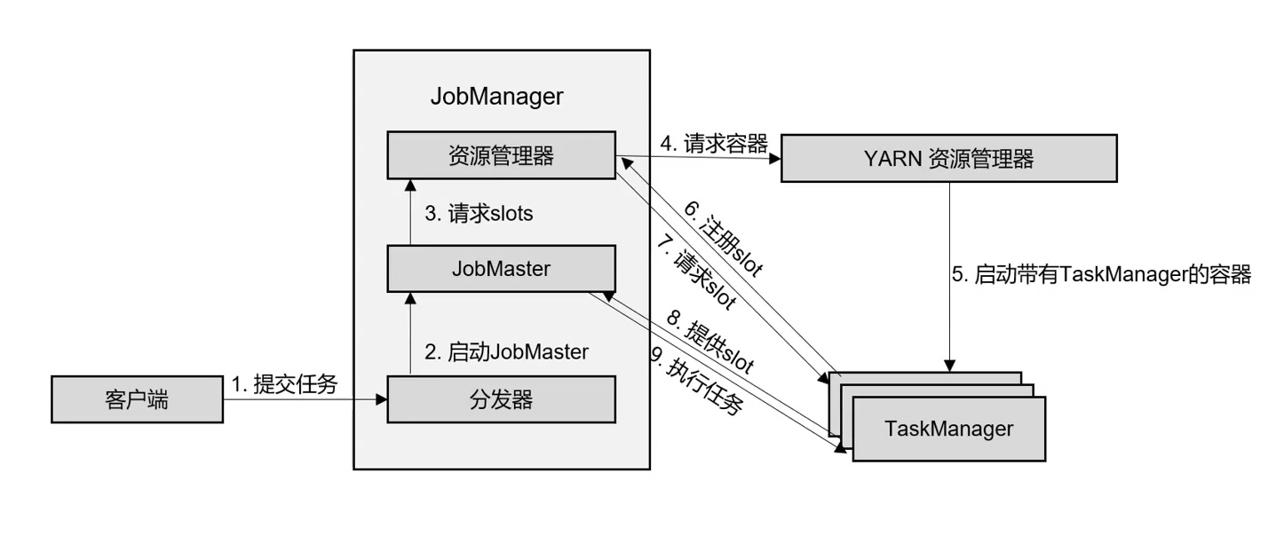 - JobManager 会向资源管 理器(ResourceManager)请求执行任务必要的资源,也就是任务管理器(TaskManager)上 的插槽(slot)。一旦它获取到了足够的资源,就会将执行图分发到真正运行它们的 TaskManager 上。而在运行过程中,JobManager 会负责所有需要中央协调的操作,比如说检 查点(checkpoints)的协调。
