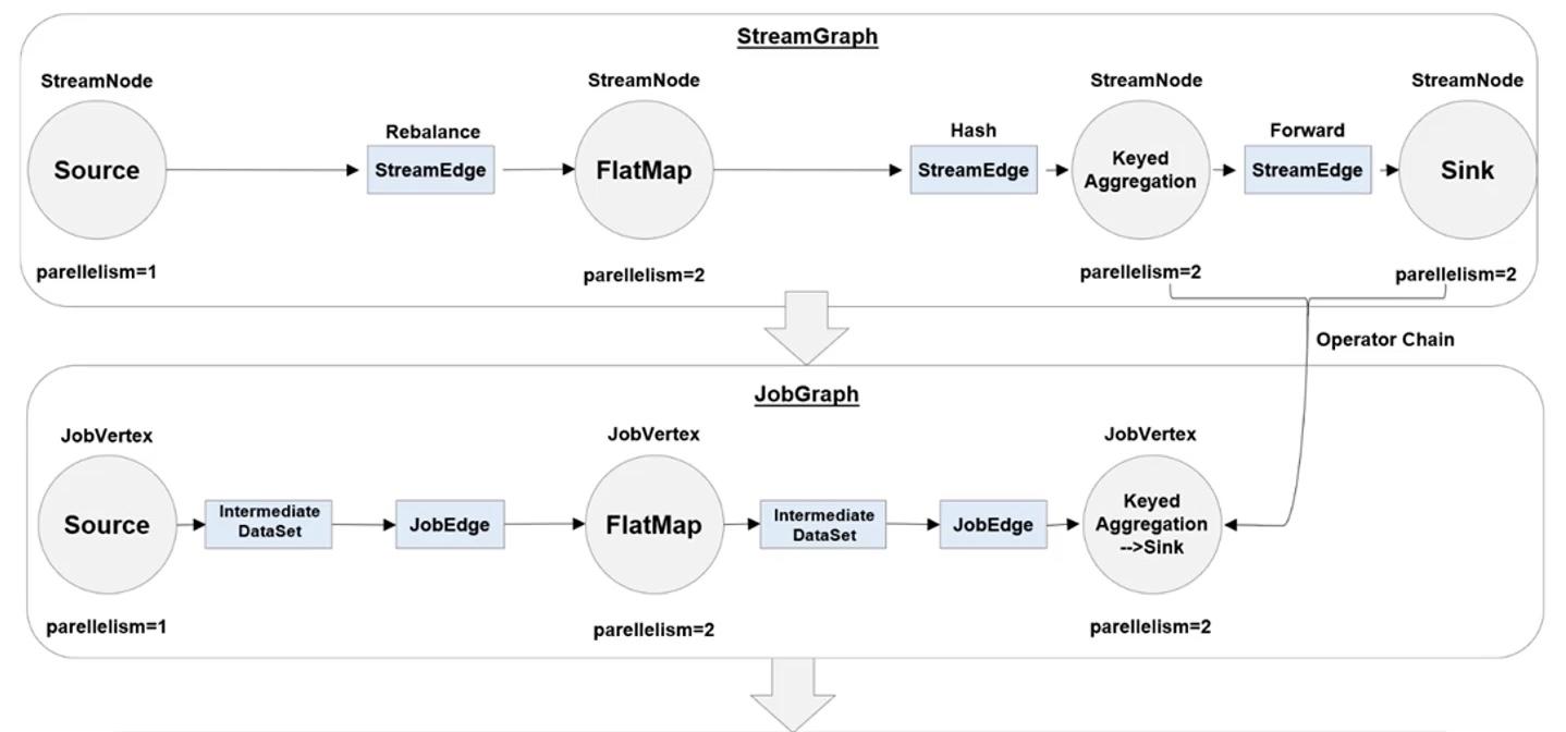 - JobGraph:StreamGraph经过优化后生成了JobGraph,提交给JobManager的数据结构。主要的优化为,将多个符合条件的节点chain在一起作为一个节点