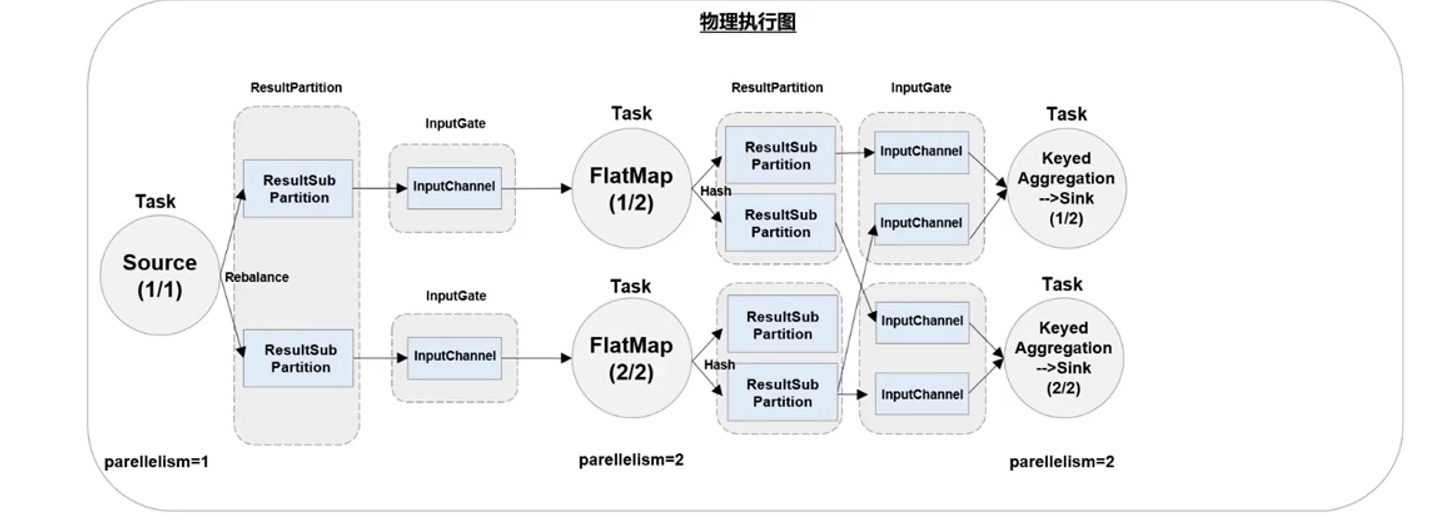 - 物理执行图:JobManager根据ExecutionGraph对Job进行调整后,在各个TaskManager上部署Task后形成的"图",并不是一个具体的数据结构。