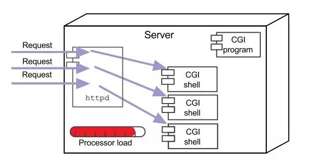 CGI的推出,使得web开发正式进入了动态处理时代,服务器能与客户有真正意义上的交流了,有能存储数据的数据库了,虽然CGI的使用周期并不长,但是一定要纪念一下它,毕竟它是里程碑式的变革。java web技术正是踩着CGI的肩膀来到了广大程序员的面前,java web解决了CGI的性能问题。CGI是以进程为单位管理请求的,而java web则是以线程为单位,处理能力更强,占用的资源更少,这个核心的组件就是Servlet。看一组资源占用图,先看CGI的: