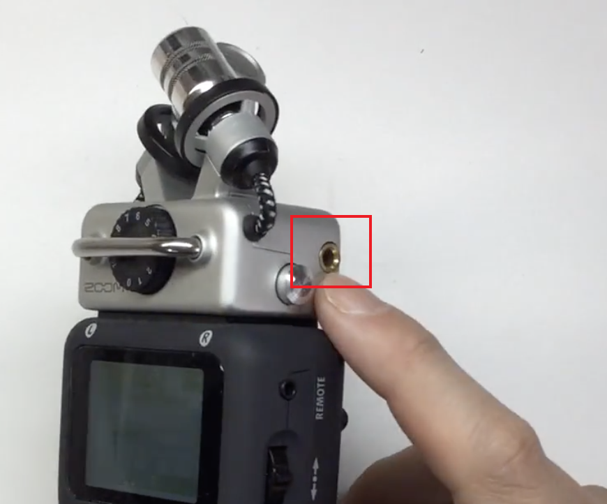 需要一根aux连接线,两头都是公的,一头插H5的LINE OUT,一头插单反,输出音量在左侧按钮设置
